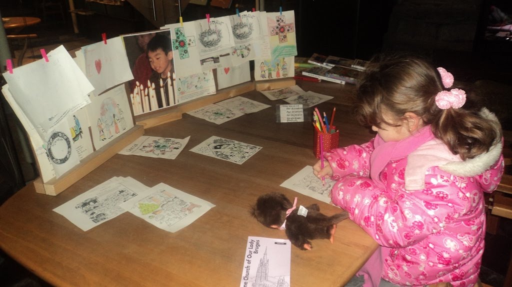 Dar köprüleri yolları geçerek tuğla yapıların en ihtişamlısı Notre Dame kilisesine ulaşıyoruz. 13. yy da yapılmış bu muhteşem eserin sipsivri kuleleri masmavi gökyüzünü deliyor sanki. Kilise içindeki “Meryem ve Çocuk” heykeli, Michalengo tarafından yapılmış ve kent için çok önemli. Burada çocuklar için ayrılan masada Duru boya kalemlerini görünce dayanamayıp oturuyor masaya ve oraya çocuklar boyasın diye bırakılan sayfalardan bir tanesini alıyor ve başlıyor boyamaya. Sonra da asıyor tüm çocukların astığı yere, Duru Tozluyurt from Turkey.