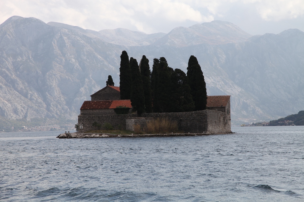 tobüsten inip karşımızdaki iki adadan -St.George ve Meryem Ana ikonunun bulunduğu ada- birine binmek üzere bir motora bindik. Adalardan St.George, doğal oluşmuş ada, çökelti sonucu. Biz buna gitmedik buraya ziyaret yok. Diğeri, sonradan yapılmış ada sanki bizim Kız Kulesi. İçinde Meryem Ana ikonusu bulunan adadan manzara da harika. Manzarası, havası, saat kulesi ile