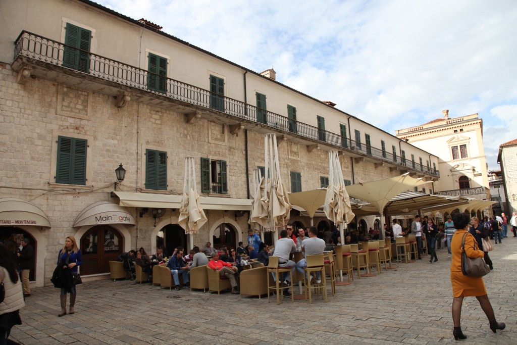 de aynı Dubrovnik gibi evlerin binaların panjurları hep yeşil ama gezi boyunca bunun sebebini hiç kimseden öğrenemedim maalesef. Yugoslavya döneminde ‘Ekim Meydanı’ denilen yer, saat kulesi,Katolik Kilisesi ve utanç abidesi en görülesi yerler bence Kotor’da. Yazın mutlaka çok daha başka oluyordur burası. Deniz, doğa, gece hayatı hepsi çok canlı yaşanıyor belli ki. Boşuna dünya jet sosyetesi burada tatil yapmıyor. Şehrin bu kadar güzel ve etkileyici olmasında bayan belediye başkanı ve yine bayan başkan yardımcısının payları büyük bence. Meydandaki kafelerden birine oturduk ve giren